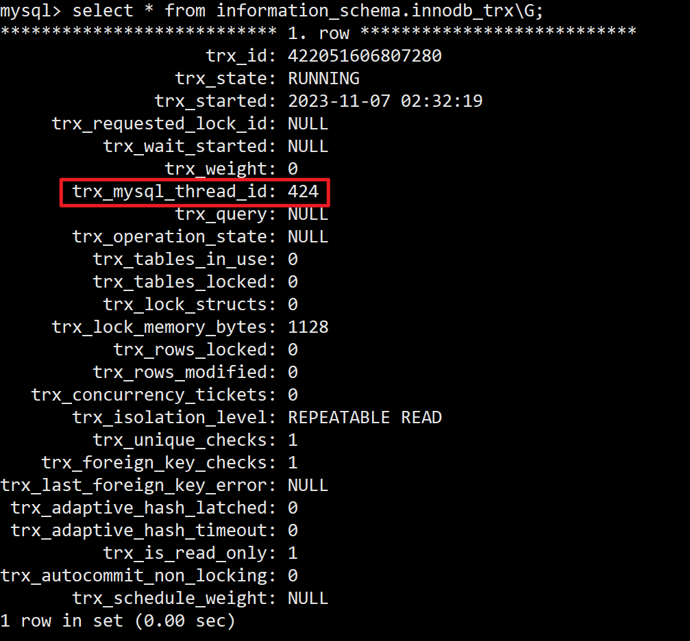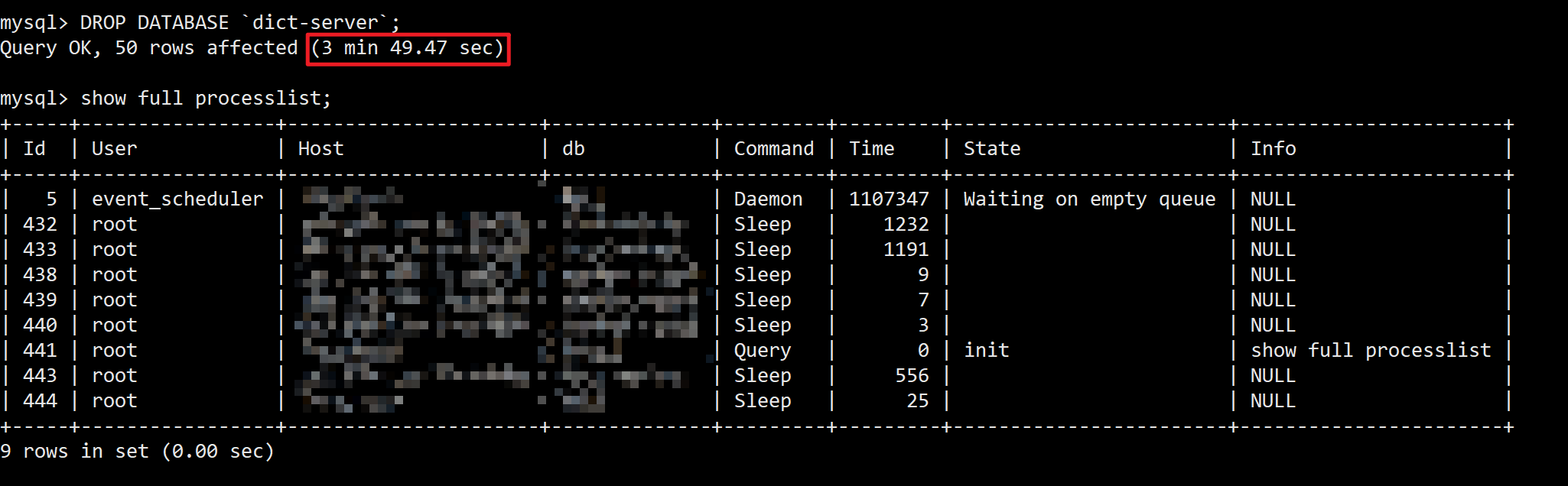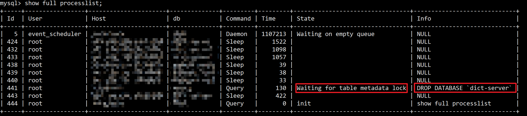 mysql控制台执行删除db库命令一直卡住,通过命令show full processlist;打印截图信息。