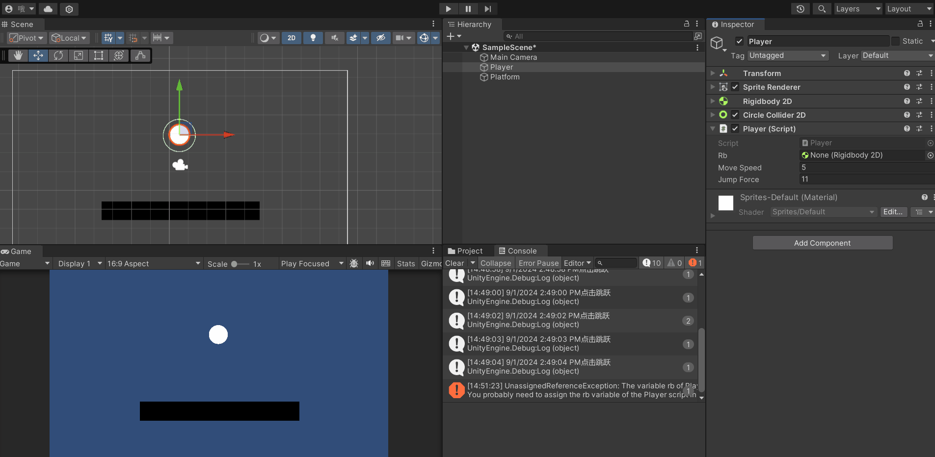 if ( Input.GetKeyDown(KeyCode.Space)) { rb.velocity = new Vector2(rb.velocity.x, jumpForce); Debug.Log(DateTime.Now+"点击跳跃"); } } }