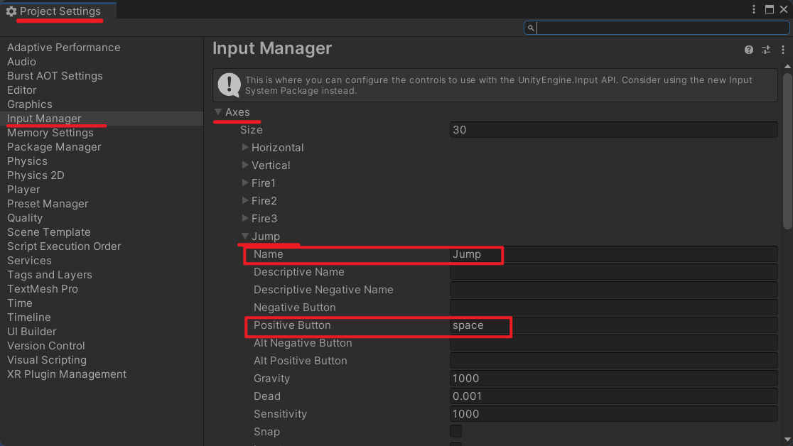 Input.GetButtonDown("Jump") 通过名称Jump可获取点击事件