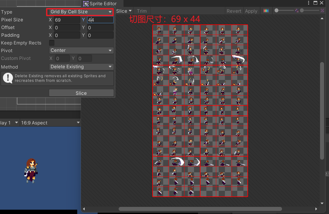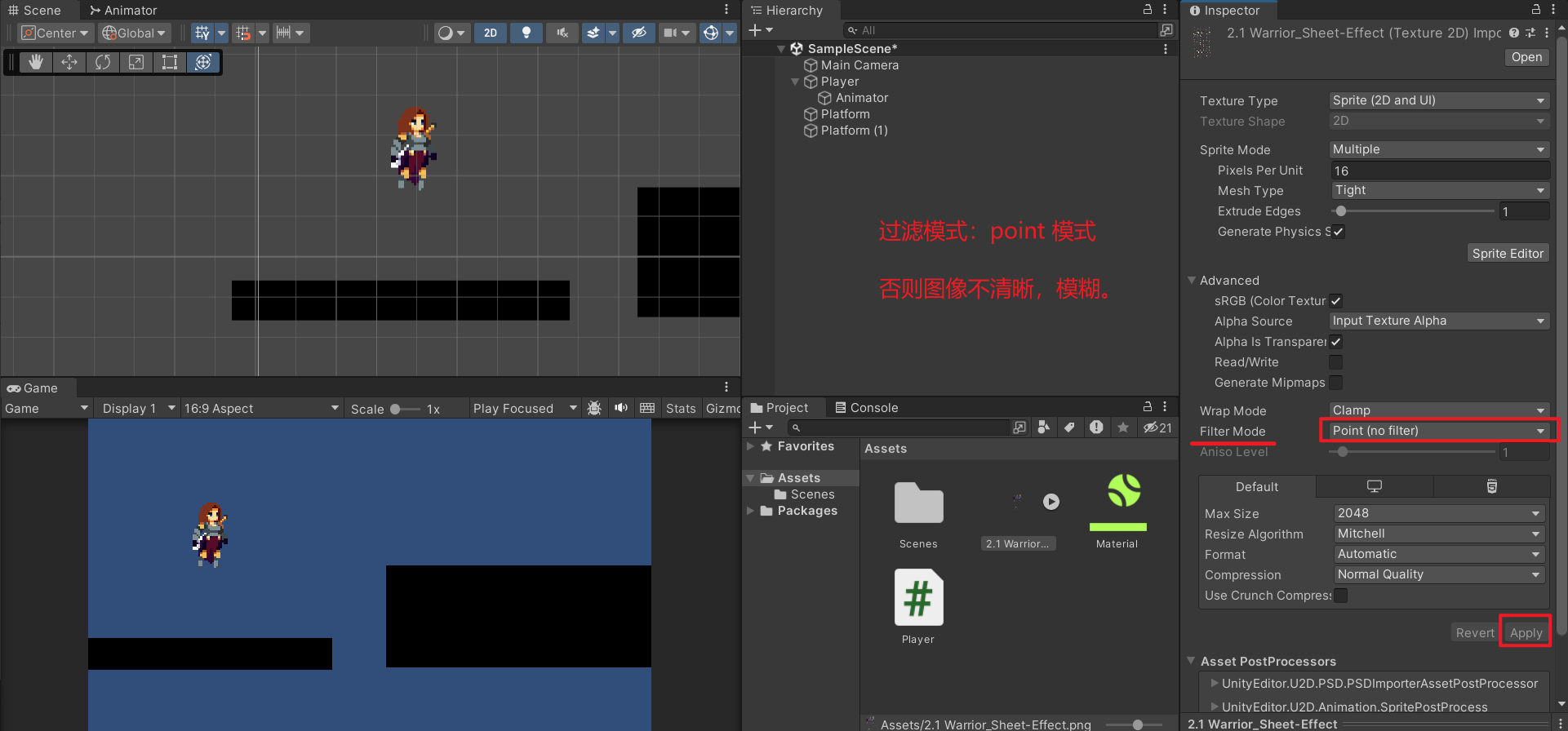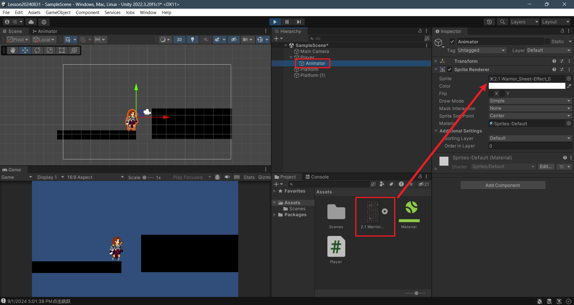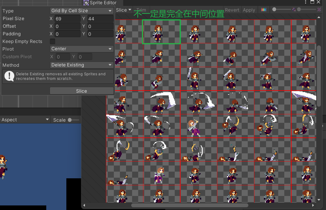 这里由于切图出来的小精灵不一定在居中位置,所以在父类Player下通过点击Create Empty创建GameObject对象,并通过调整位置,将父类和子类的中心点接近一致,在将小精灵材质赋予Animator对象。