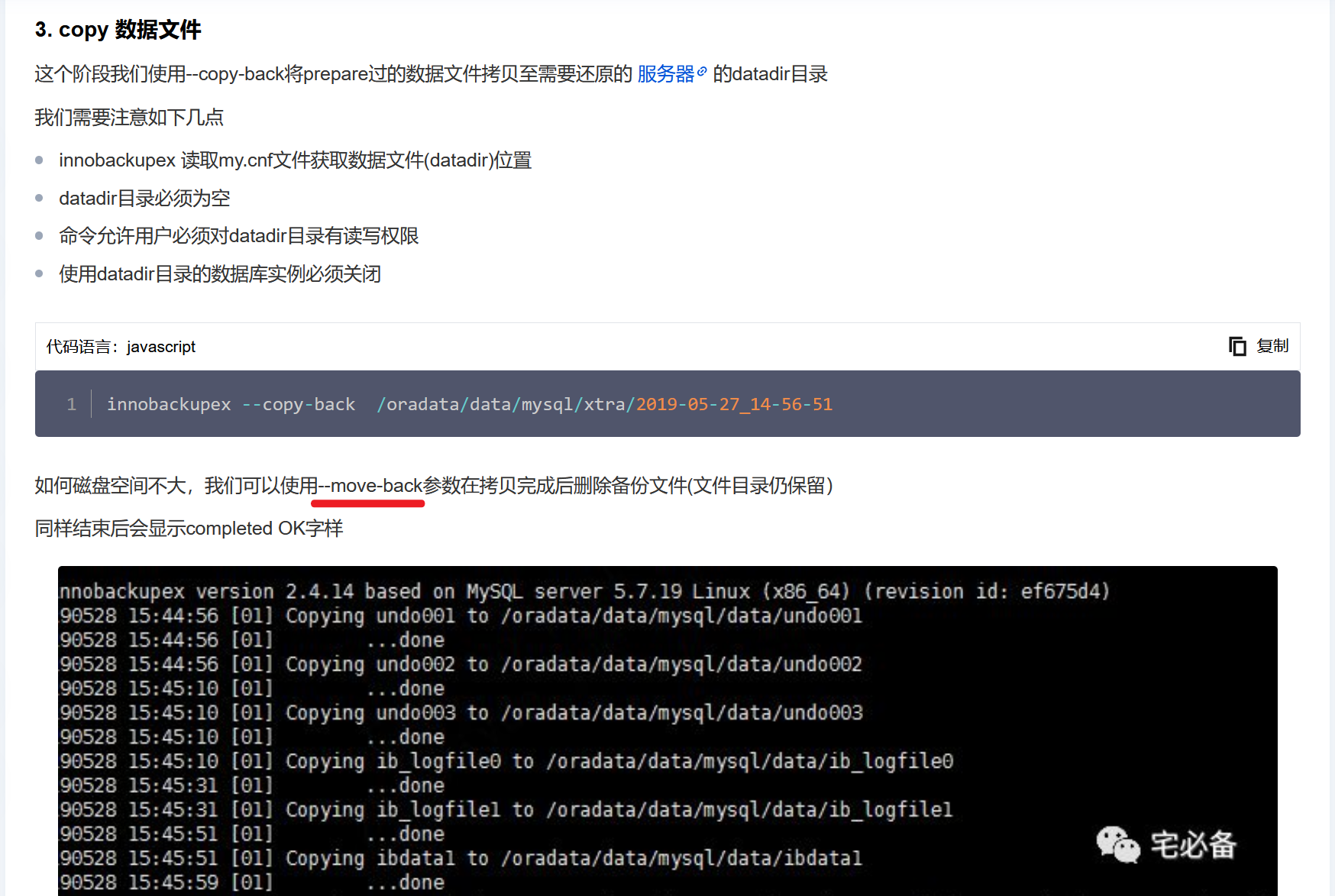 sudo innobackupex --defaults-file=/etc/my.cnf --move-back /var/mysql_bkdata/ |