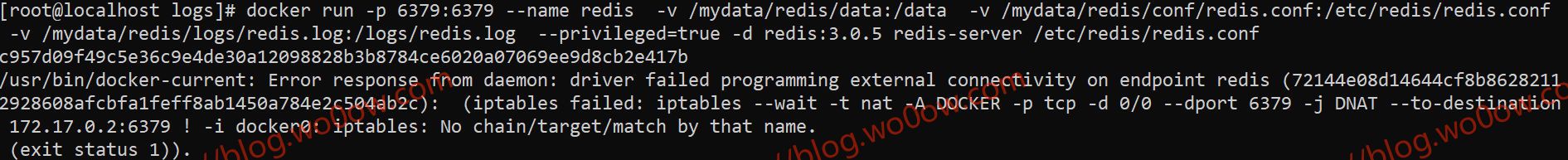 /usr/bin/docker-current: Error response from daemon: driver failed programming external connectivity on endpoint redis (72144e08d14644cf8b86282112928608afcbfa1feff8ab1450a784e2c504ab2c): (iptables failed: iptables --wait -t nat -A DOCKER -p tcp -d 0/0 --dport 6379 -j DNAT --to-destination 172.17.0.2:6379 ! -i docker0: iptables: No chain/target/match by that name. |