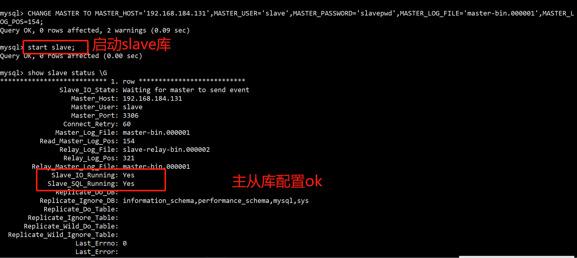 CHANGE MASTER TO MASTER_HOST='192.168.0.121',MASTER_USER='repl',MASTER_PASSWORD='GrantT^Slave130',MASTER_LOG_FILE='mysql-bin.000020',MASTER_LOG_POS=154; |