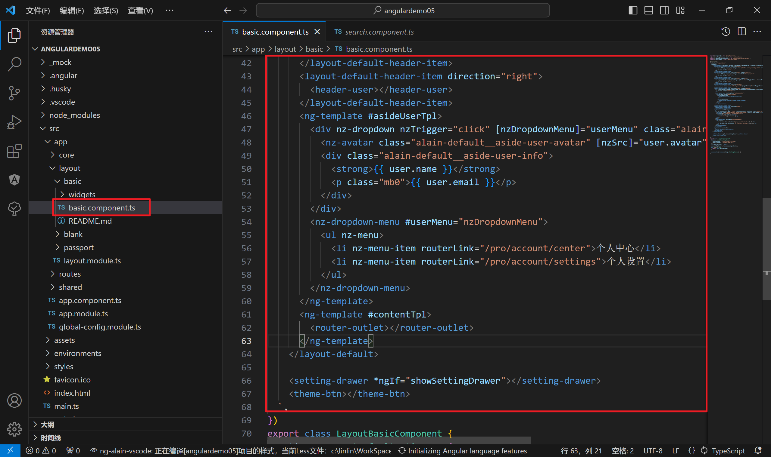 在使用ng new project项目后,注意此时项目已初始化git init,在后续往项目中添加ng add ng-alain后,首次运行yarn start项目正常启动并预览。