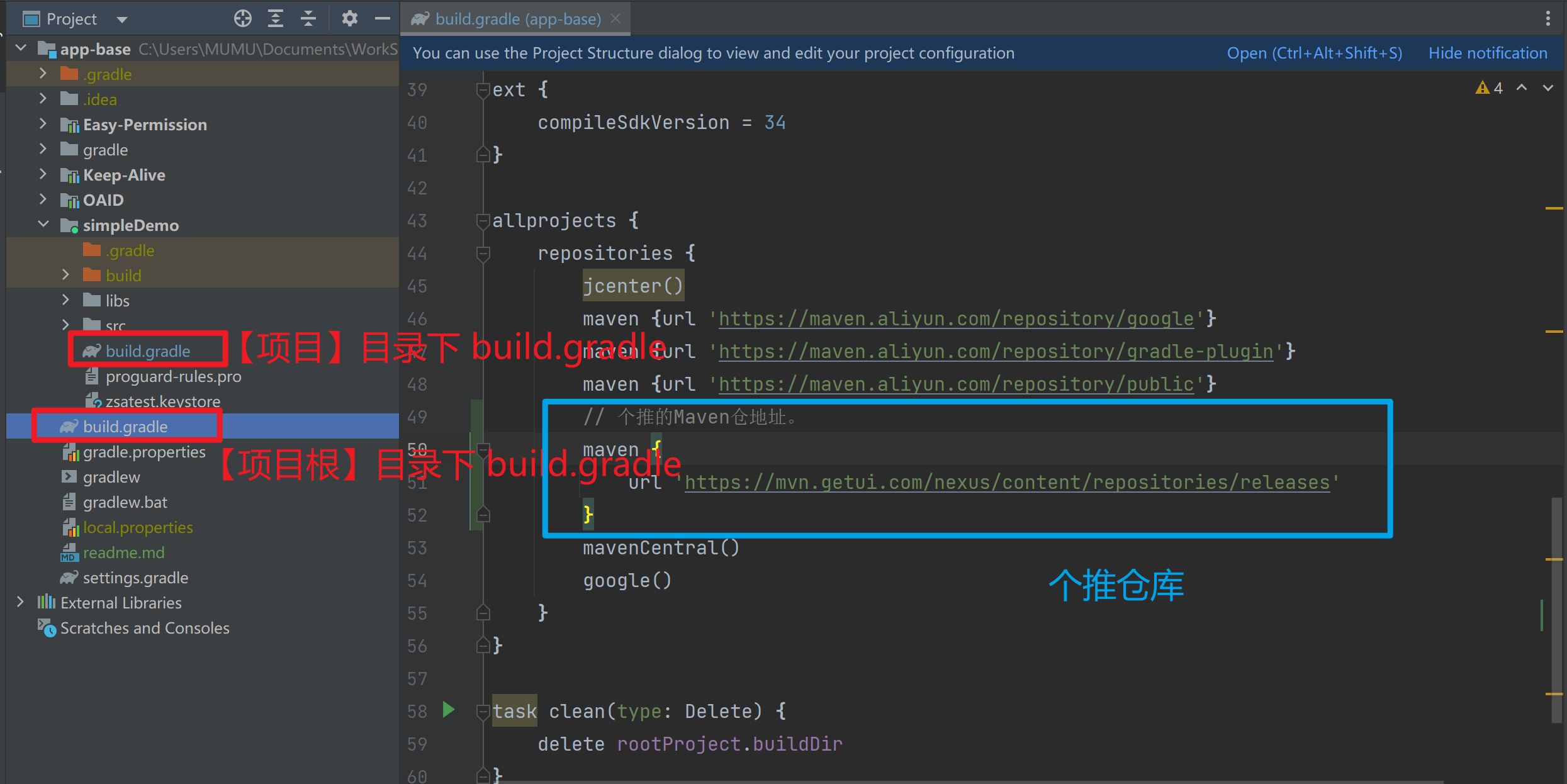 allprojects { repositories { jcenter() google() // 个推的Maven仓地址。 maven { url 'https://mvn.getui.com/nexus/content/repositories/releases' } } }