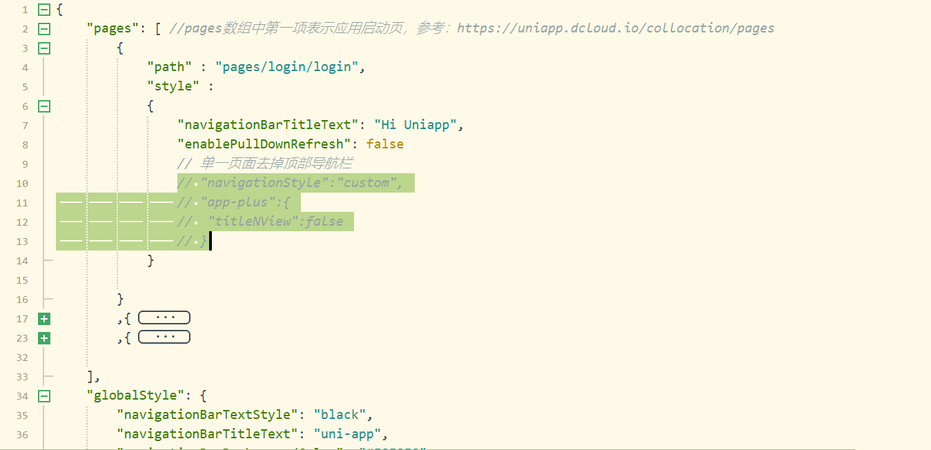 { "path" : "pages/login/login", "style" : { "navigationBarTitleText": "Hi Uniapp", "enablePullDownRefresh": false // 单一页面去掉顶部导航栏(移除注释,请留意上方代码末尾','需要补全) // "navigationStyle":"custom", // "app-plus":{ // "titleNView":false // } } }