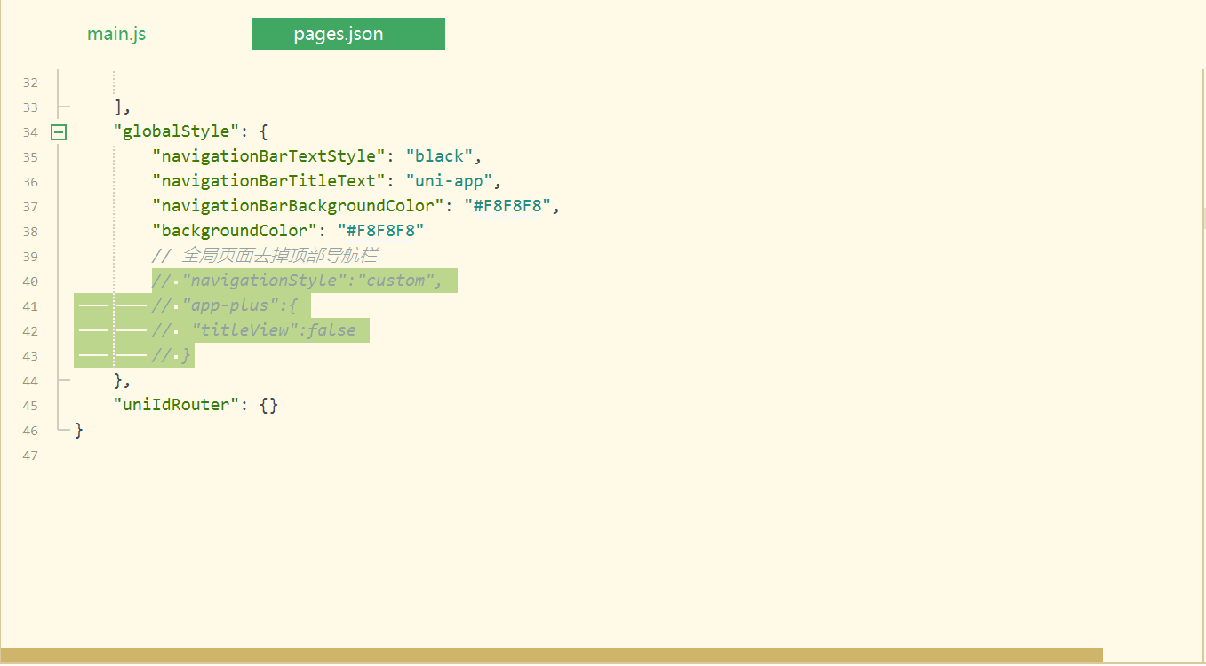 "globalStyle": { "navigationBarTextStyle": "black", "navigationBarTitleText": "uni-app", "navigationBarBackgroundColor": "#F8F8F8", "backgroundColor": "#F8F8F8", // 全局页面去掉顶部导航栏(移除注释,请留意上方代码末尾','需要补全) // "navigationStyle":"custom", // "app-plus":{ // "titleView":false // } }