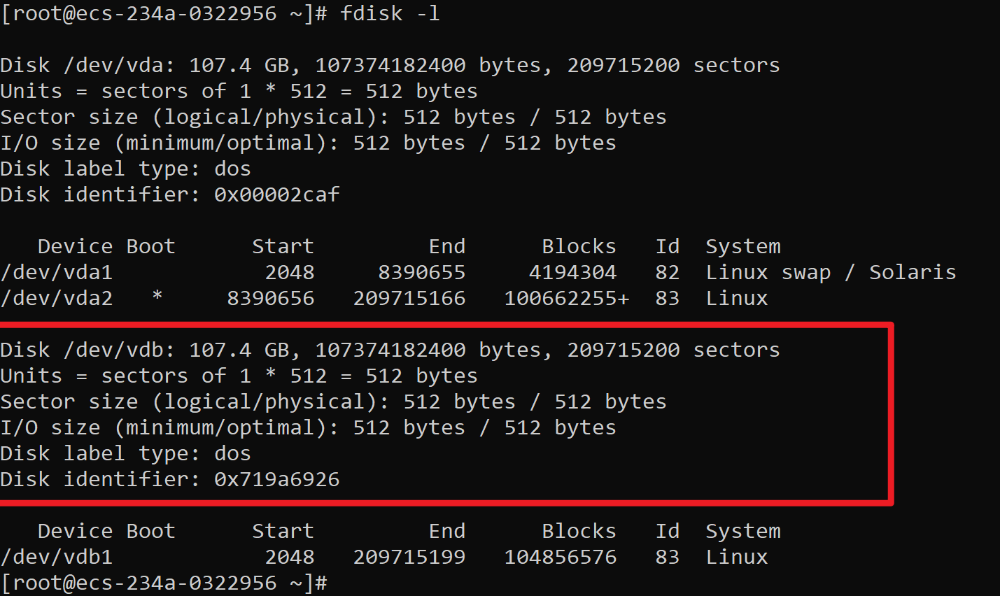 Device Boot Start End Blocks Id System /dev/sdb1 2048 41943039 20970496 83 Linux