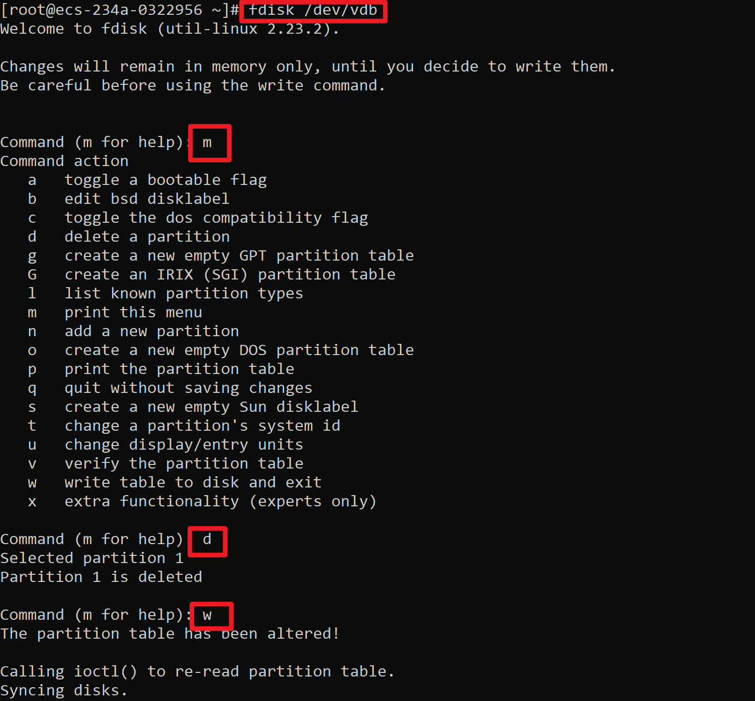 Command (m for help): m Command action a toggle a bootable flag b edit bsd disklabel c toggle the dos compatibility flag d delete a partition g create a new empty GPT partition table G create an IRIX (SGI) partition table l list known partition types m print this menu n add a new partition o create a new empty DOS partition table p print the partition table q quit without saving changes s create a new empty Sun disklabel t change a partition's system id u change display/entry units v verify the partition table w write table to disk and exit x extra functionality (experts only)