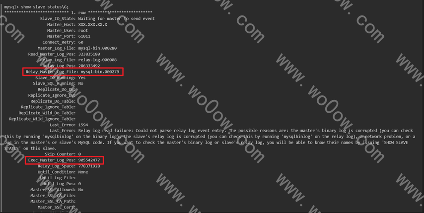 mysql> show slave status\G; *************************** 1. row *************************** Slave_IO_State: Waiting for master to send event Master_Host: XXX.XXX.XX.X Master_User: root Master_Port: 61011 Connect_Retry: 60 Master_Log_File: mysql-bin.000280 Read_Master_Log_Pos: 323835180 Relay_Log_File: relay-log.000008 Relay_Log_Pos: 286333492 Relay_Master_Log_File: mysql-bin.000279 Slave_IO_Running: Yes Slave_SQL_Running: No Replicate_Do_DB: Replicate_Ignore_DB: Replicate_Do_Table: Replicate_Ignore_Table: Replicate_Wild_Do_Table: Replicate_Wild_Ignore_Table: Last_Errno: 1594 Last_Error: Relay log read failure: Could not parse relay log event entry. The possible reasons are: the master's binary log is corrupted (you can check this by running 'mysqlbinlog' on the binary log), the slave's relay log is corrupted (you can check this by running 'mysqlbinlog' on the relay log), a network problem, or a bug in the master's or slave's MySQL code. If you want to check the master's binary log or slave's relay log, you will be able to know their names by issuing 'SHOW SLAVE STATUS' on this slave. Skip_Counter: 0 Exec_Master_Log_Pos: 905542477 Relay_Log_Space: 778371928 Until_Condition: None Until_Log_File: Until_Log_Pos: 0 Master_SSL_Allowed: No Master_SSL_CA_File: Master_SSL_CA_Path: Master_SSL_Cert: Master_SSL_Cipher: Master_SSL_Key: Seconds_Behind_Master: NULL Master_SSL_Verify_Server_Cert: No Last_IO_Errno: 0 Last_IO_Error: Last_SQL_Errno: 1594 Last_SQL_Error: Relay log read failure: Could not parse relay log event entry. The possible reasons are: the master's binary log is corrupted (you can check this by running 'mysqlbinlog' on the binary log), the slave's relay log is corrupted (you can check this by running 'mysqlbinlog' on the relay log), a network problem, or a bug in the master's or slave's MySQL code. If you want to check the master's binary log or slave's relay log, you will be able to know their names by issuing 'SHOW SLAVE STATUS' on this slave. Replicate_Ignore_Server_Ids: Master_Server_Id: 50