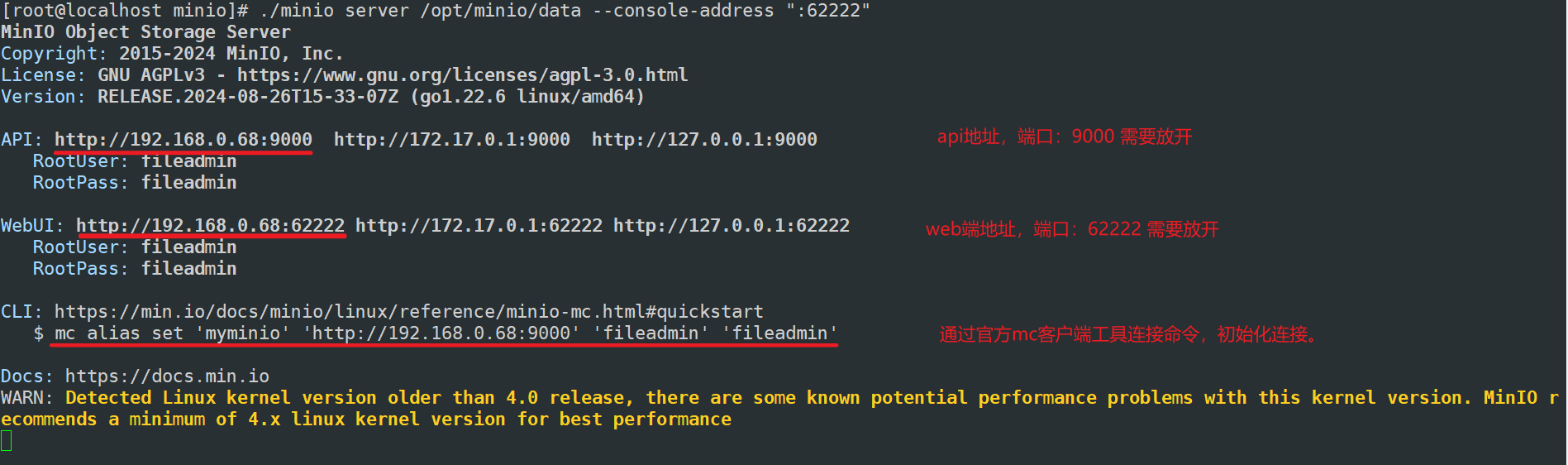 注意:当从单minio构建集群minio,原单minio的数据data目录必须重建,否则启动报错!INFO: Unable to use the drive http://10.xx.xx.96:9000/xiaomu_logs/minio/data: drive not found, will be retried INFO: Waiting for a minimum of 1 drives to come online