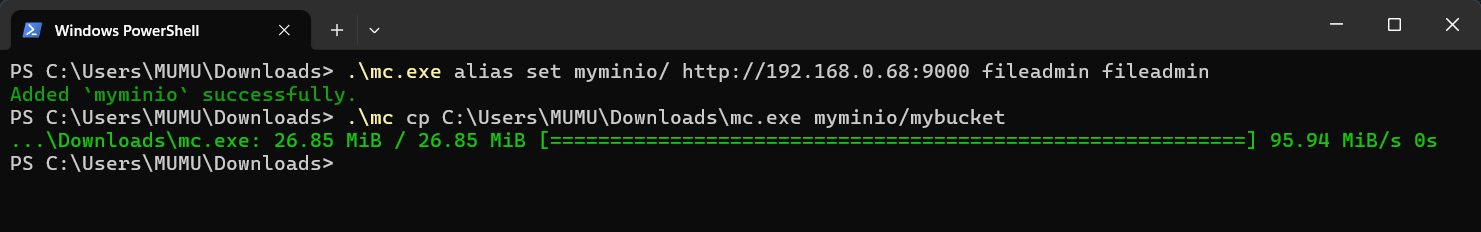 C:\mc.exe alias set myminio/ http://MINIO-SERVER MYUSER MYPASSWORD