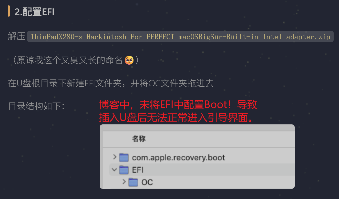 当通过离线恢复安装BigSur之后,记得把U盘中的EFI文件夹通过PE盘放入之前参考博客安装中分区的EFI盘中。(不然,你就一直拿着U盘进行引导吧!)