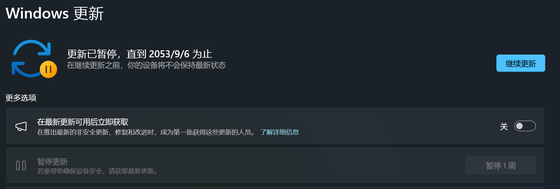 reg add "HKEY_LOCAL_MACHINE\SOFTWARE\Microsoft\WindowsUpdate\UX\Settings" /v FlightSettingsMaxPauseDays /t reg_dword /d 9999 /f |