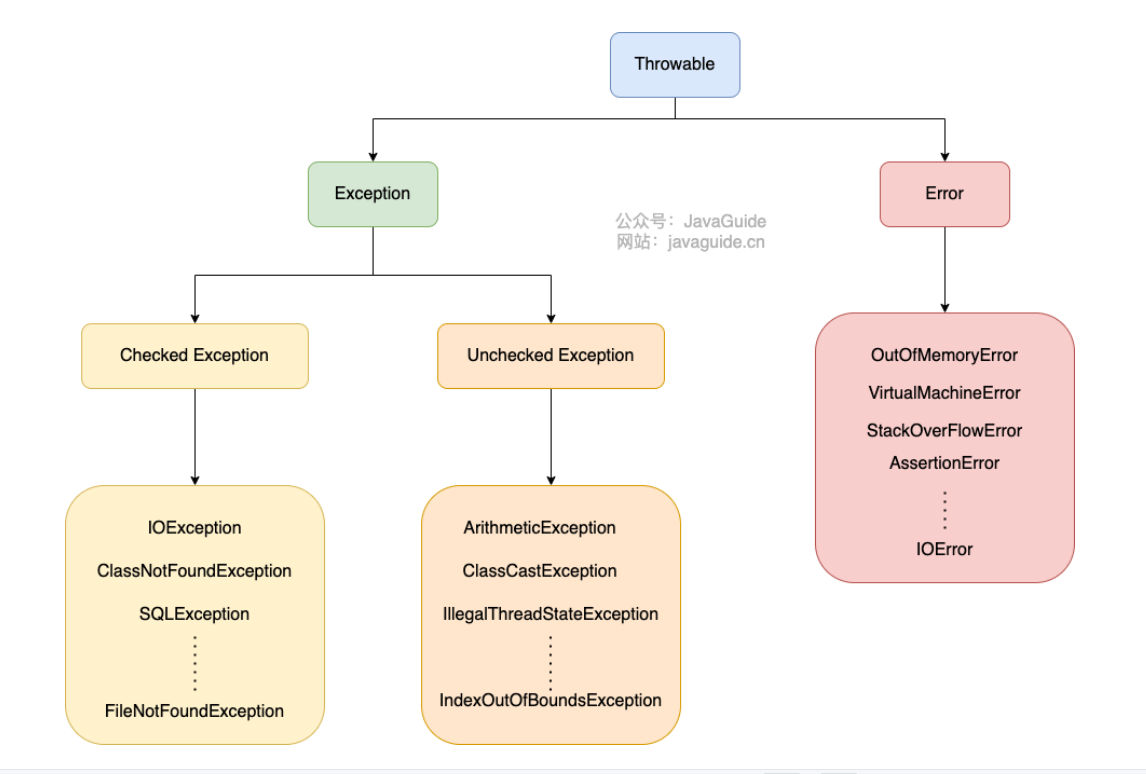 属于程序无法处理的错误.例如: Java虚拟机错误(Virtual MachineError)、虚拟机内存不够错误( OutOfMemoryError )、类定义错误( NoClassDefFoundError )等 。这些异常发⽣时,Java 虚拟机(JVM)⼀般会选择线程终⽌.