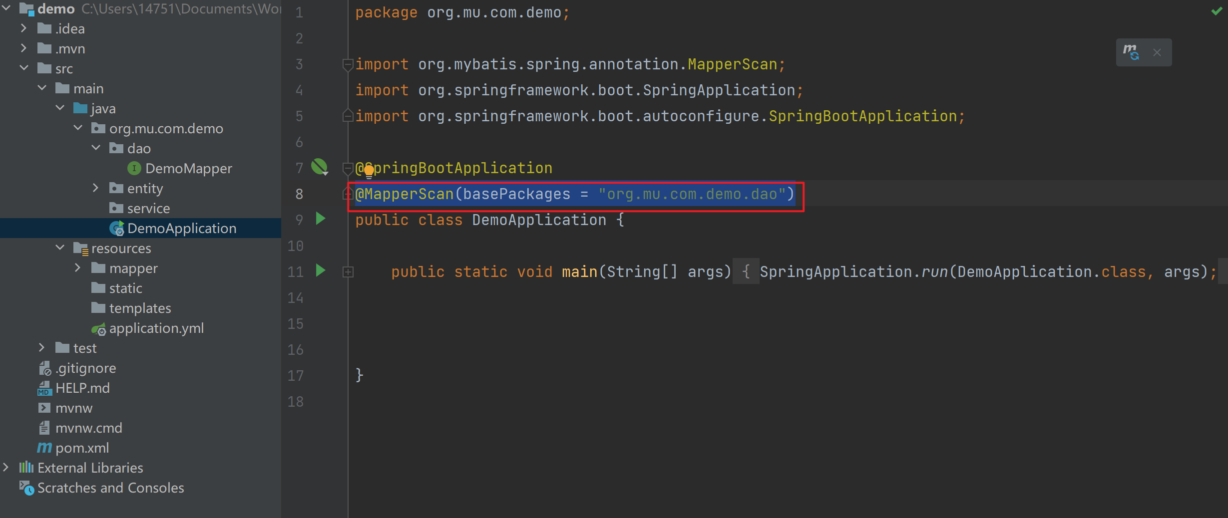 @MapperScan(basePackages = "org.mu.com.demo.dao") |