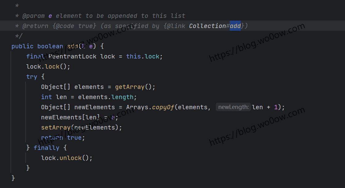 CopyOnWrite的add方法,使用Lock来加锁,一次只允许一个线程进行写操作