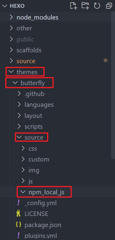 在Hexo的themes主题目录下,所选择的主题文件butterfly(我这里是这个)下的source目录添加npm_local_js目录用来做本地化js资源文件