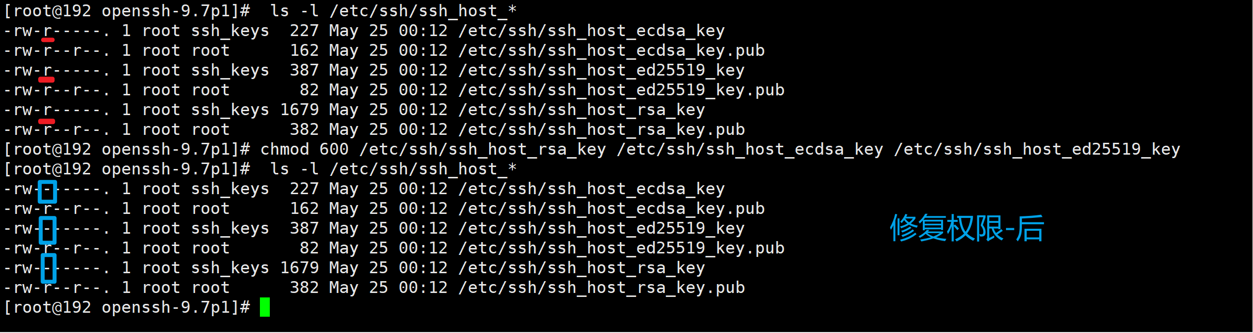 chmod 600 /etc/ssh/ssh_host_rsa_key /etc/ssh/ssh_host_ecdsa_key /etc/ssh/ssh_host_ed25519_key |