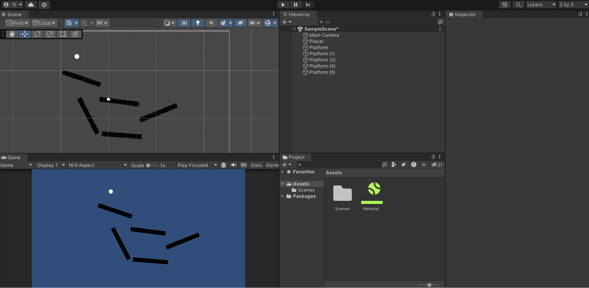 复制出多个平台,弹跳系数降低,让小球自己滚动。